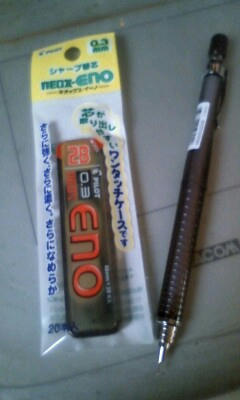 文具屋に用事があったので0.3のシャーペンを購入。家に1本あるけど買うのは初めて…好きな色・型じゃないけど、久しぶりの浪費で気分はウキウキ。(2Bの芯は初めてなんだよな…enoをうっかりeroと読んでしまったり…)